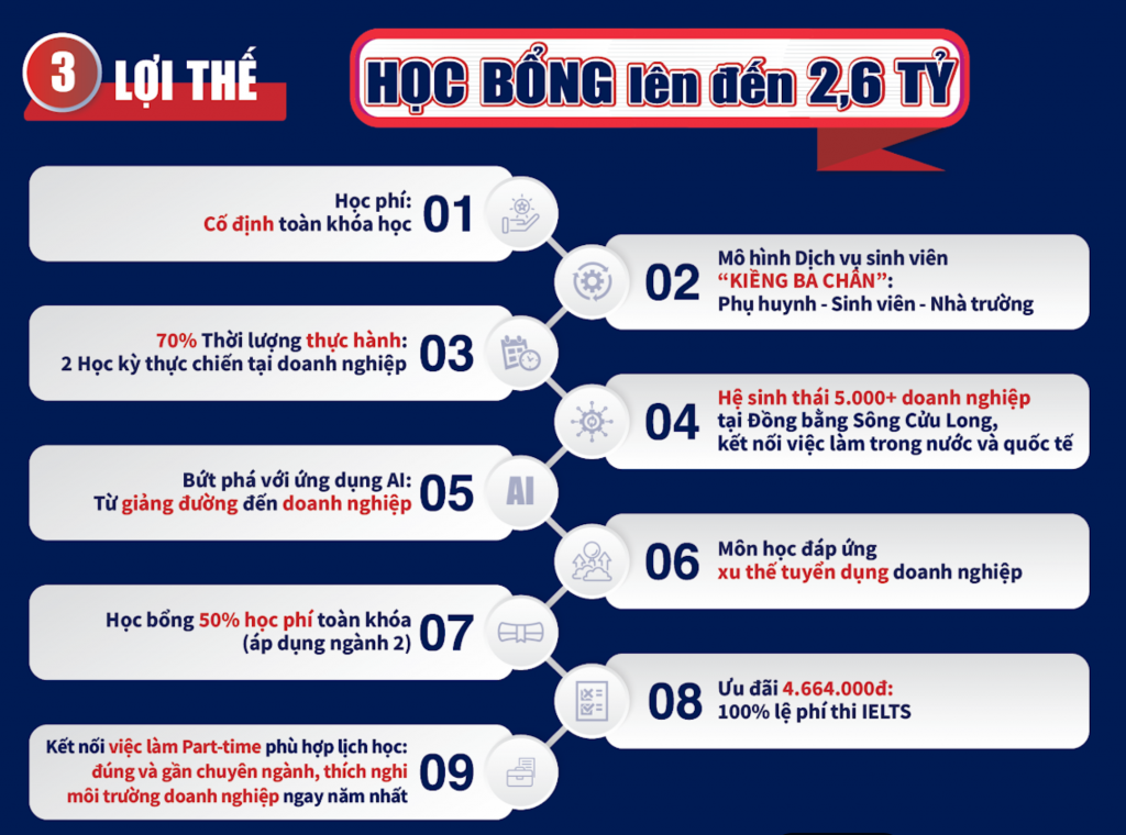 - Học bổng đặc biệt đến 4.664.000đ (năm 2024) khi đạt chứng chỉ IELTS 5.0.